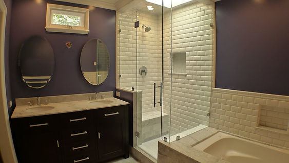 Bold purple walls accent the 3D subway tiles lining the shower and bathtub. Accented by white carrera marble and a deep espresso double vanity for a warm and distincitve look.